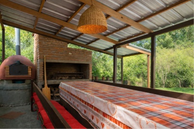 Parrillero exteriior techado con horno de barro acompañado de mesa y bancos de hierro.
